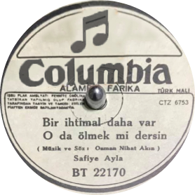 Safiye Ayla (1907-1998) İstanbul’da doğar. Piyano çalarak başladığı müzik yaşamı uzun yıllar sürmüştür. Gazinolarda sahneye çıkar. Radyoda okudukları ve plak kayıtlarıyla, zengin bir repertuvarın sahibidir. Şarkılar, türküler, gazeller, revü şarkılarını plaklara okur. Selahattin Pınar, Sadettin Kaynak, Yesari Asım Arsoy’un eserlerini plaklara ilk okuyan sanatçıdır. “Alabanda Revüsü” isimli sahne gösterisinde Kraliçe Mimoza rolünde büyük başarı elde eder. Konservatuvar İcra Heyetinde görev yapar. Safiye Ayla, Osman Nihat Akın’ın nihavend makamında bestelediği, gündelik yaşamda artık bir deyim gibi kullanılan “Bir ihtimal daha var, o da ölmek mi dersin” şarkısıyla seçkiye girmiştir. → C.Ü.