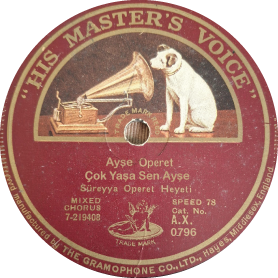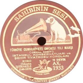 Sahibinin Sesi, Cumhuriyet’in onuncu yılı için Cemal Reşit Rey tarafından bestelenen marşı, AX 1933 seri numarasıyla 78’lik bir taş plak olarak yayınladı. İstanbul Belediyesi Opera Orkestrası ve Bandosu, eseri plağın bir tarafına sözsüz olarak çalıp kaydetti. Plağın arka yüzüne ise sözlü olarak kaydedilmişti. Bestecisinin yönettiği orkestra, bu kez Şehir Tiyatroları korosuna eşlik etti. Binlerce baskısı yapılan plak okullara, yurt dışı temsilciliklerine dağıtıldı. “Onuncu Yıl Marşı”nın sevilip yaygınlaşmasında bu plağın etkisi büyüktür. İstanbul Belediyesi 90 yıl önce plak yayıncılığının içinde olmuştur. Bugün de olmaktadır. → C.Ü.